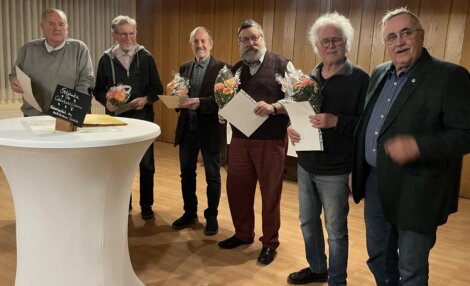 Ehrungen für (v.l.):Uwe Pfeffer, Joachim Türnagel,Gerhard Berend, Hubertus von Rundstedtund Peter Lenslerüberreicht von Dietrich Gädke