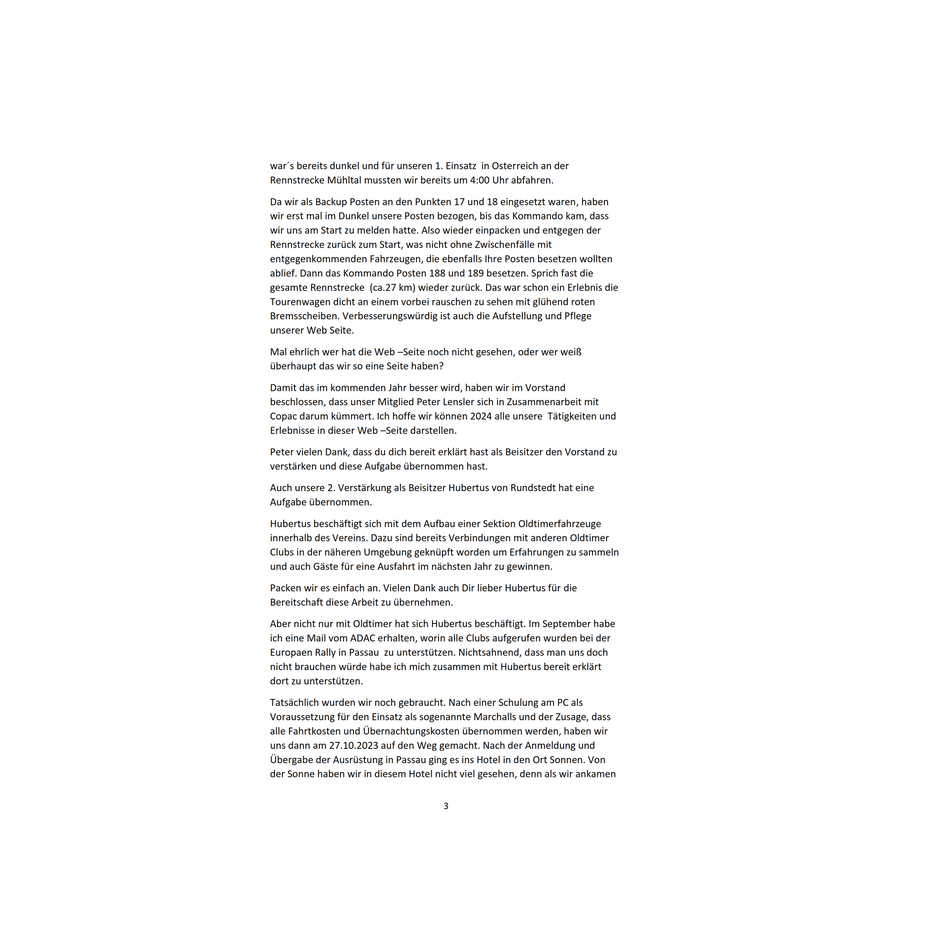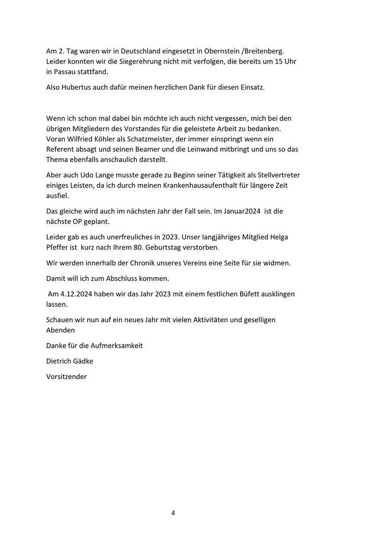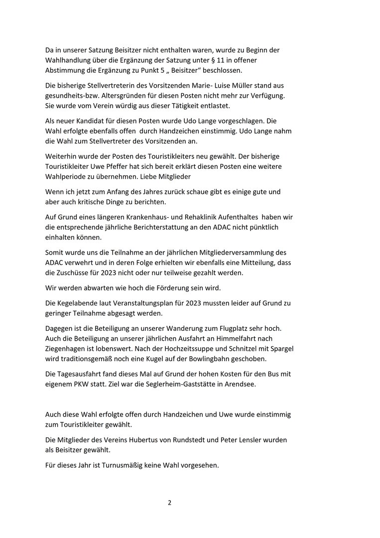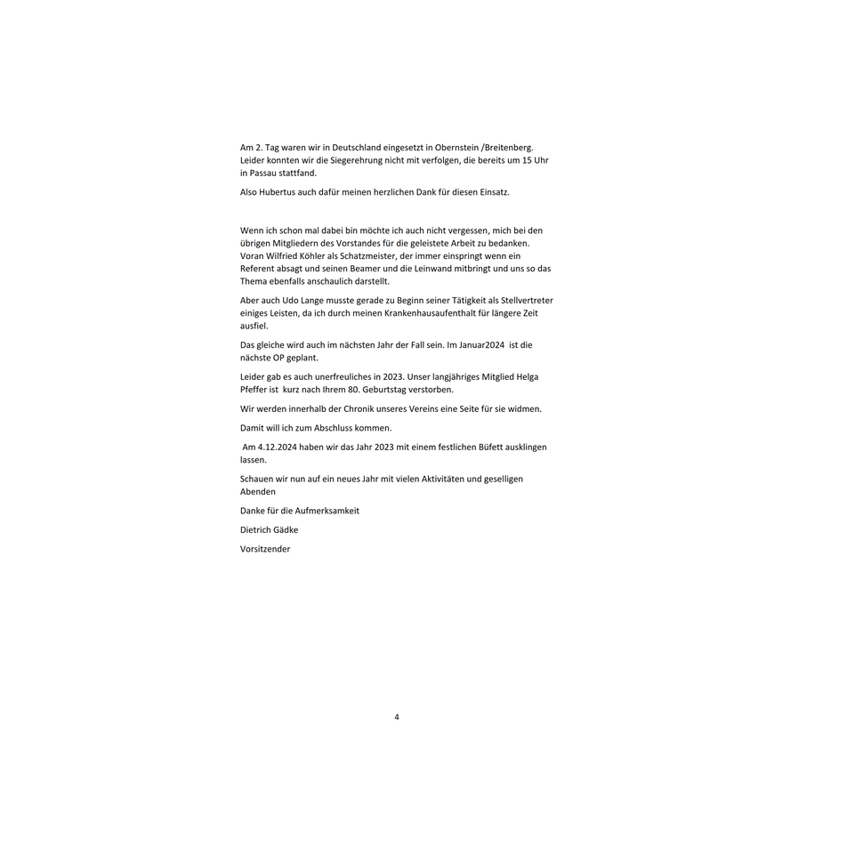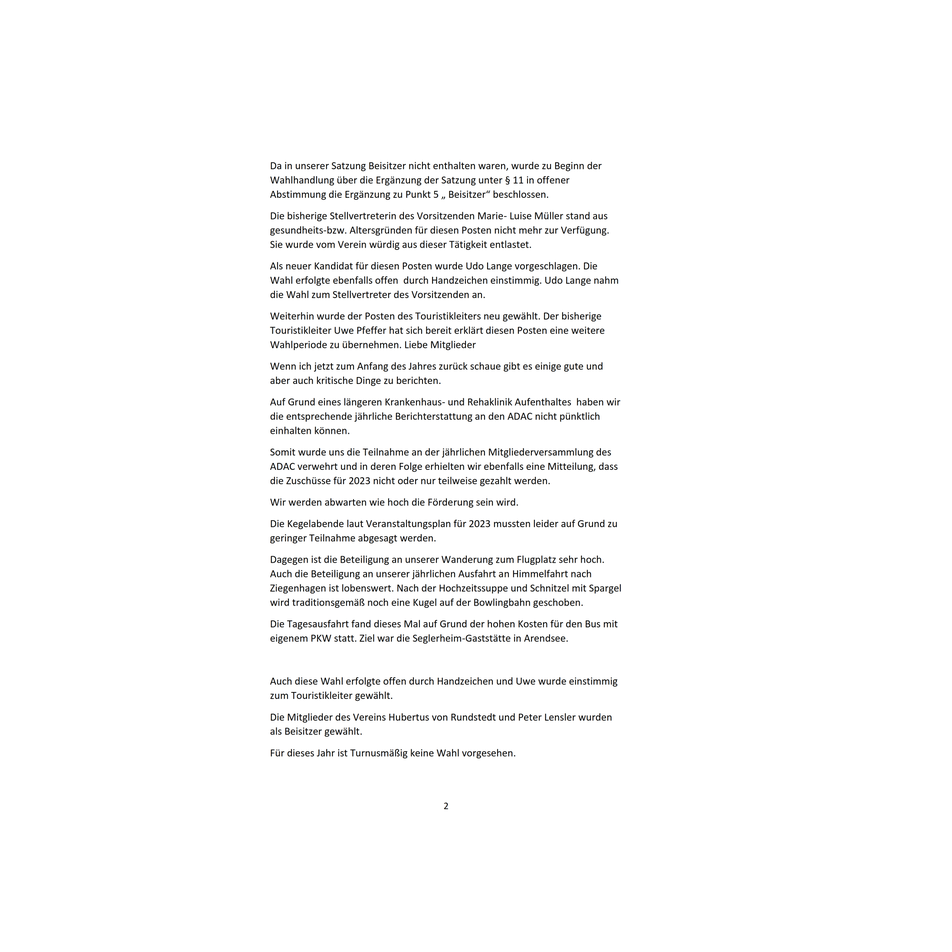 Da die geforderten Unterlagen auf Grund eines Krankenhausaufenthaltes meinerseits nicht rechtzeitig eingereicht wurden, ist die Teilnahme an der Mitgliederversammlung versagt worden. Damit verbunden auch keine Förderungszahlungen für die Arbeit im Jahr 2023.